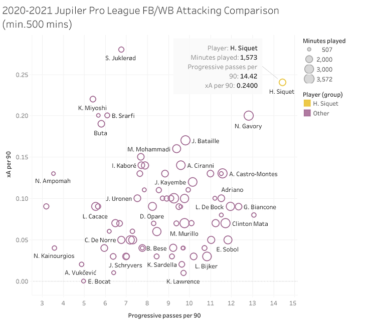 Siquet’s general progressive ability cannot be understated either as his game is not exclusively dependant on his crossing ability. His 14.4 progressive passes per 90 in the league last campaign were a leading figure for full-backs with over 500 minutes showing his propensity and desire to move the ball forward in an effective manner. Siquet’s technical ability facilitates quick interchanges along the right flank and into central areas as he is fairly creative with the areas he receives the ball and also positions he runs into. Comfortable with either inverting his runs to then play a through pass out wide or hogging the touchline before darting diagonally behind the defensive line; Siquet is ultimately flexible in the build-up of attacks.
