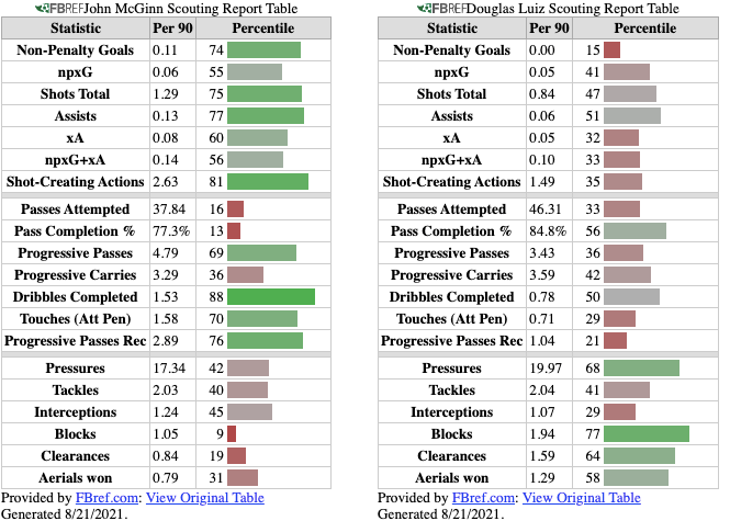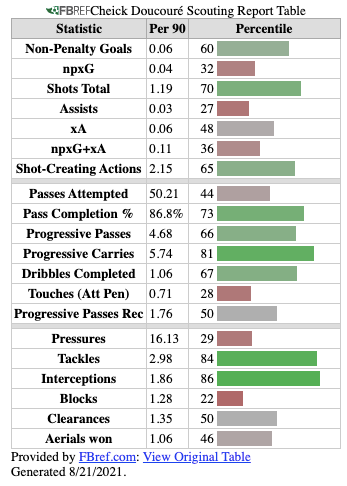 Doucouré’s overall FBref (via StatsBomb) Scouting Report summarises a more complete midfielder in comparison to Villa’s current options.