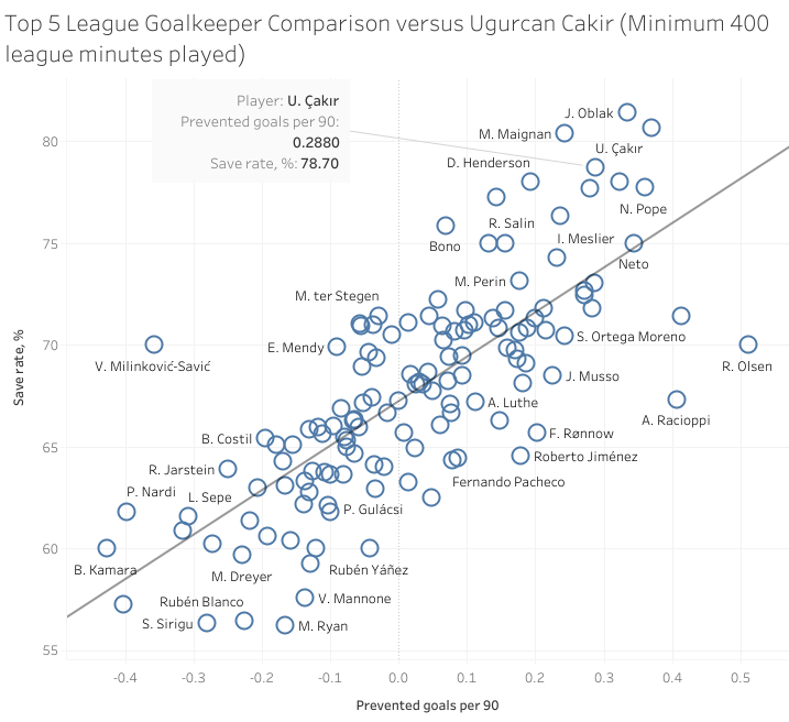 Çakır’s reflexes mixed with strong footwork and flexibility mean he is able to fend off opposition shots at different levels. 47.4% were saves with reflexes suggesting he is comfortable with depending on his natural reactions to stop shots rather basing his game solely on intuitive positioning.