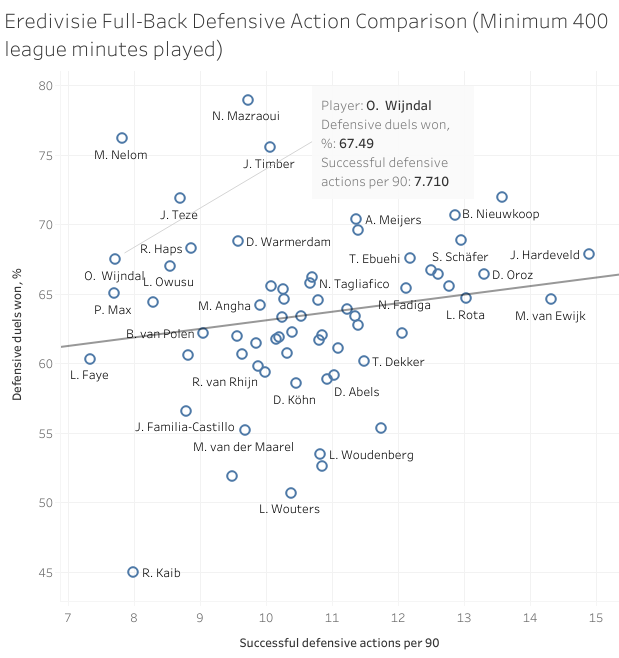 Although, Wijndal’s attacking responsibilities are in line with the modern full-back he is fairly efficient in the defensive phase. Operating in a possession orientated system at one of the Eredivisie’s most distinguished teams Wijndal does partake in less defensive actions than most but he has the capability to defend well when called upon. Wijndal’s mobility and footwork serve him well in defensive phases alongside keeping a decent upright posture although he struggles with over-aggressive tendencies.
