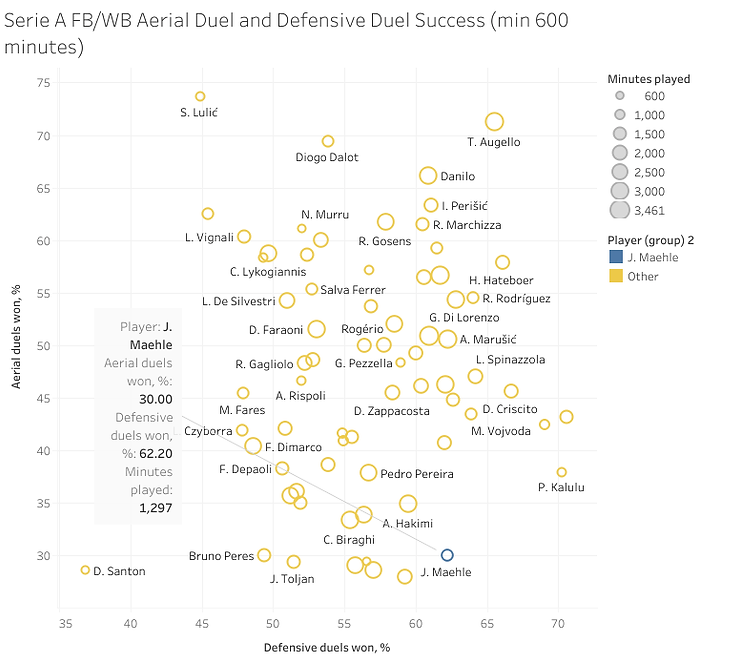 Despite being 6’0” which is fairly tall for modern full-backs, Mæhle struggles with aspects of the physical side of the game. He demonstrates a propensity to mistime jumps into aerial duels and struggles to gain leverage on the opposition. An aerial duel success rate of only 30.0% is pretty appalling for a nominal defender within a top league.