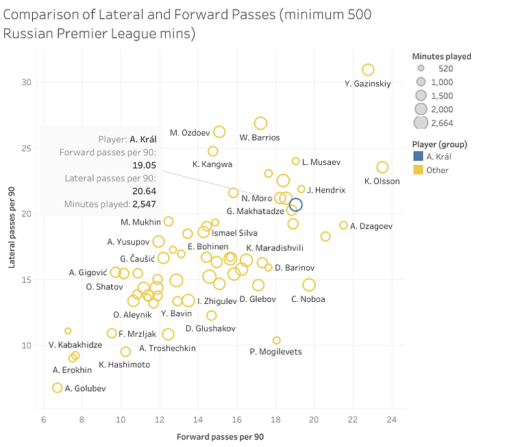 Playing as the deepest midfielder, Král often has time to weigh up his options before moving the ball onwards which he usually does in efficiently. He provides a balance of recycling possession and ball progression. Král initiates many of Spartak’s progressive movements by playing through the lines and out wide. Rarely will he look to play a pass backwards to the keeper, instead favouring lateral passes to centre-backs when dropping deep and forward passes into the bevy of Spartak’s attacking-minded players. His role and Spartak’s style of play comprises a need for prudent passing on occasion but as shown below Král enjoys dictating the tempo by mixing up lateral passes with forward passes.