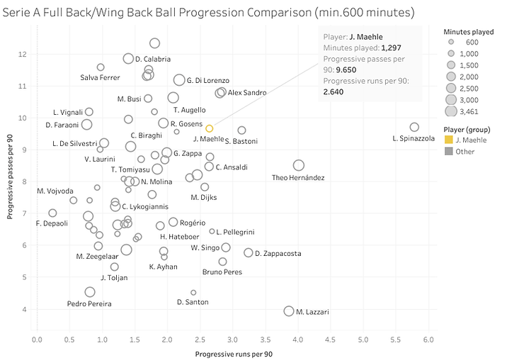 Mæhle’s attacking endeavours rank him highly in progression parameters in both runs and passes within the Serie A. In addition to this, his touches in the oppositions box per 90 rank him within the 94th percentile of all full-back’s and wing-back’s within Europe’s top 5 Leagues and European competitions this season according to Statsbomb data via FBREF.