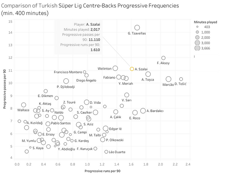 Passes are not the only progressive tool to Szalai’s game as he has a penchant for progressive runs which is very in tune with the modern demands on centre-backs. Although this was more prominent within his time at Apollon Limassol where he averaged 2.17 progressive runs per 90 in the 2020-2021 league season, he still completes 1.61 per 90 in the Turkish Süper Lig. An obvious indicator of the higher standards Szalai is now playing at as he cannot leave his base position as frequently but this does not deter his overall confidence in moving out with the ball.