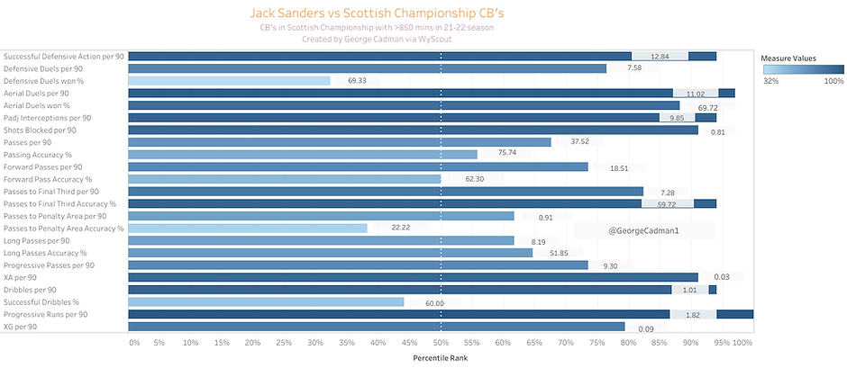 Due to his build, Sanders is adept at positioning his frame between man and ball to protect possession and then subsequently carry the ball. Simply put not many can dispossess him once he holds the ball, the opposition has to double up on him from multiple angles to win back the ball. Furthermore, his good level of agility combined with a composed poise enable him to move and adjust seamlessly with the ball at feet. As a result, Sanders is able to progress the ball proactively as shown below by his 1.82 progressive runs per 90. In possession, Sanders is adequate as when allowed time he can punch passes through the lines with accuracy. When pressed particularly on his weaker left-foot, Sanders’ touch becomes heavier and loses control of his passes. It must be noted that Kilmarnock as a top side had the most possession in the Scottish Championship so were typically licensed with more time and space on the ball. Moving into the Premiership, they won’t be afforded such factors, meaning Sanders’ fundamental possession-based skills will be more tested. Adopting a more open posture and increasing his speed of play on his left foot is required.