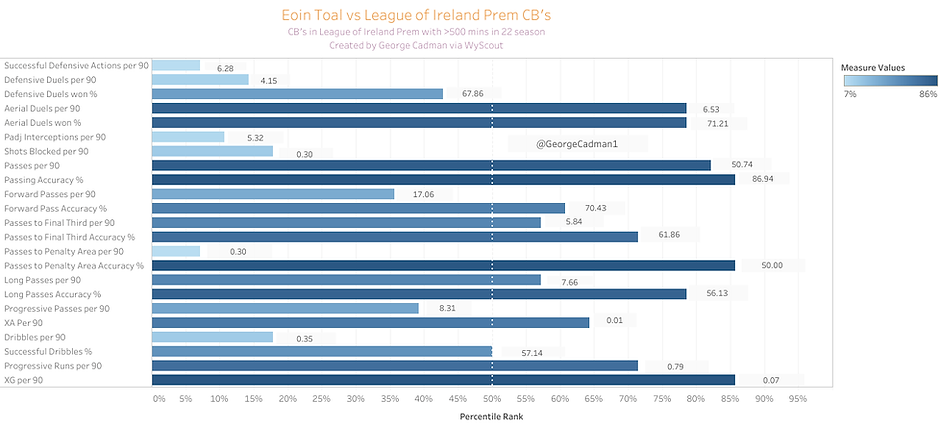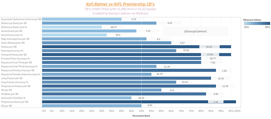 Defensively Balmer is a very solid option even if the bar chart suggests a weakness. The Northern Irish Premiership is stacked with physical centre-backs as well as the league containing many smaller forwards, resulting in a high amount of centre-backs who dominate duels. An overall defensive duel rate of 68.37% is not to be dismissed, McNally’s in comparison was 72.50%. Many centre-backs across the leagues would strive to achieve this level of duel rate success. 6’0″ is a rather modest height for centre-backs but Balmer does not get bullied in challenges easily and matches McNally’s build besides the four-inch differential. A key strength of Balmer’s game is his anticipation and front-footed approach alongside his strong agility which results in a good amount of interceptions and shots blocked; thus disrupting the opposition’s final third plans. However, Balmer is very susceptible to being rash in a challenge as shown by 12 yellows and a red card in the 2021-22 campaign, an area to work on for sure with the need for increased composure.