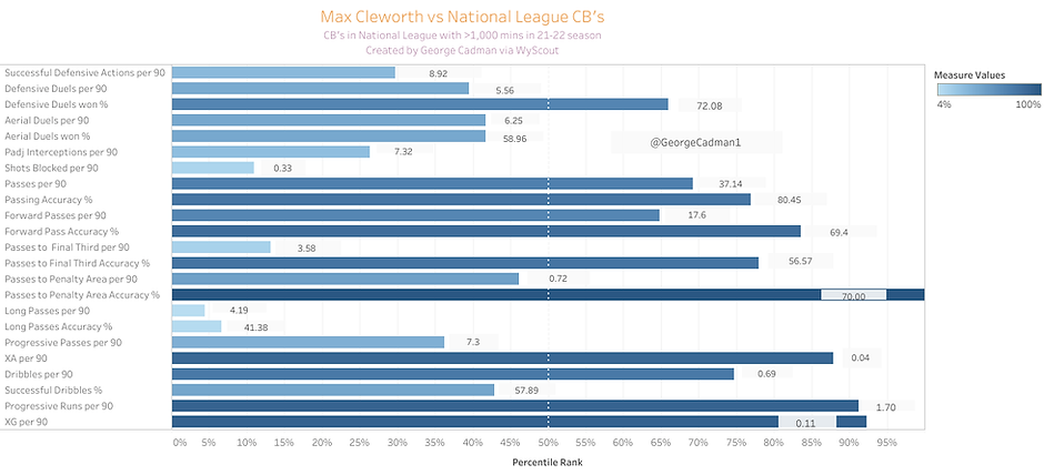 Capable of playing across the three centre-back positions, Cleworth mainly featured as either the left or middle CB in Wrexham’s attacking 3-5-2 formation. Comfortable on the ball with both feet, it would be hard to tell his favoured foot. Cleworth is a talented ball-player at his age and recycles the ball very well with a high accuracy of passes for the level he plays at. Cleworth can play progressively but tends to favour short passes to the wing-backs or midfielders on the second line. Perhaps he can be bolder with possession but it’s a good trait to be secure on the ball. Interestingly, Cleworth has the capability to step out in possession and make a central run with the ball past the halfway line as implied by his 1.70 progressive runs per 90. In the past Cleworth has featured in midfield positions and it’s apparent he has maintained the need to carry the ball from this into his more defensive role.