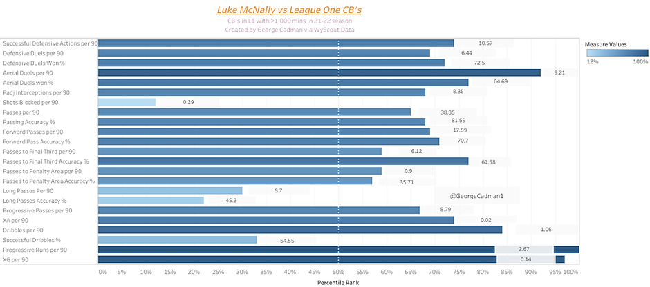 In possession, McNally is a very solid ball-player who enjoys venturing forward with the ball at feet. An overall passing accuracy of 81.59% is evident of a player who is tidy but often looks to thread the needle through the lines. All of his passing metrics (besides long-passing) indicate an above-average League One ball-player who should translate well to the Championship. Arguably, the most impressive statistic of McNally’s resume though is his 2.67 progressive runs per 90, a figure that led all League One CB’s in 21-22 with over 1,000 minutes. This is where McNally is at his best using his competent ball control, imposing size and quick acceleration to drive the ball into the right-sided channel which would suck in defenders.